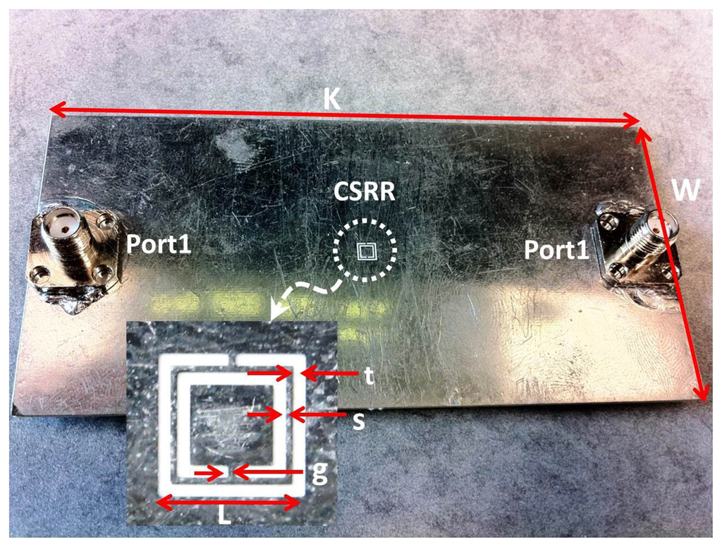 Unlike conventional wire antennas, where the resonant frequency is directly proportional to the length of the radiator, the resonant frequency of electrically-small resonators, such as CSRR and SRR resonators, is typically found through measurement or simulation [7,16,18,24,25]. In general, however, the larger the overall size of the electrically-small resonator, the lower its resonant frequency Here, we consider correlating the topological dimensions of a CSRR element to its resonant frequency for the purpose of obtaining useful design guidelines. Because the sensor is a two-port microstrip line exciting a CSRR, a vector network analyzer (VNA) is used to measure the reflection and transmission parameters. In order to match the internal impedance of the VNA in our measurement setup, the microstrip line was designed to have a characteristic impedance of 50 Ω (the microstrip line can be designed to match the internal impedance of other measurement setup devices). To achieve a 50 Ω characteristic impedance for the microstrip line using Rogers RO4350 substrate with a thickness of 0.75 mm, a permittivity of 3.66 and a loss tangent of 0.0031, the width of the microstrip line was 1.7 mm.
