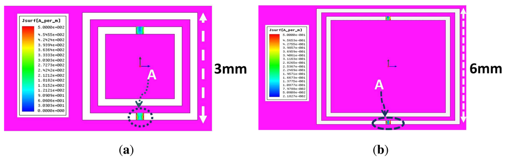 The sensitivity of the CSRR sensor is determined by how much the near field of the resonator can be disturbed by defects in materials causing the resonance frequency to shift. In addition, the size of detects is essential for determining the length of the CSRR, which, in turn, corresponds to the resonance frequency of the sensor. In this section, we investigate factors affecting the sensitivity of the CSRR sensor by careful analysis of the surface current distribution on the resonator. We considered two CSRRs of gap separations and trace widths of 0:2 mm with different lengths of 3 mm and 6 mm. Figure 6 shows the current surface distribution density on the narrow bridges, which was found to be the highest over the entire sensor CSRR surface. The maximum surface current density yields the highest magnetic field from any part of the sensor, and thus, the most sensitive part of the CSRR sensor is the narrow bridge linking the inner island to the outer plane conductor. Figure 7 shows the magnetic field lines around the sensing element.