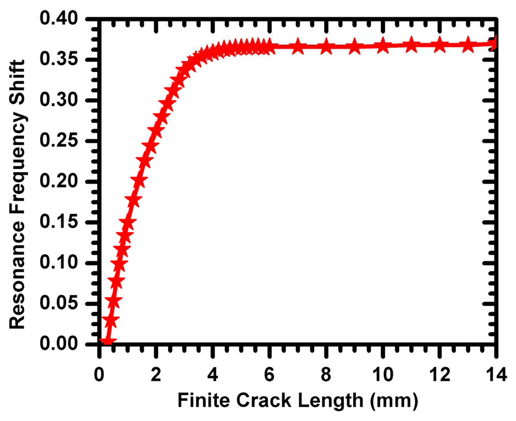 The resonance frequency of the CSRR sensor (plotted in Figure 3) represents the sensor in the absence of the metallic surface to be detected. When the sensor is placed on the solid metallic surface, the resonance frequency shifts. The resonance frequency of the sensor in the presence of the solid crack-free surface is used as the reference resonance frequency. Any shift in the resonance frequency due to the presence of a crack is then compared to the reference frequency. The crack considered in [7] extended across the entire width of the aluminum block under test. Here, we use numerical simulation to test the effectiveness of the CSRR sensor to detect cracks of finite length, which represents a scenario more practical than that of very long cracks. Figure 8 shows the resonance frequency shift experienced by the 3-mm CSRR sensor for different crack lengths (a crack width of 0.2 mm and a depth of 2 mm). For a crack with a very short length, Figure 8 shows a very small shift in the resonance frequency, as would be expected. As the crack length increases, the shift in the resonance frequency increases, until the crack length becomes approximately equal to the length of the sensor (in this example, a 3-mm CSRR sensor was used). Increasing the crack length further did not lead to any additional increase in the resonance frequency shift. In Figure 9, we show the effect of varying the crack depth on the resonance frequency shift for a 0.2 mm-wide and 15 mm-long crack.