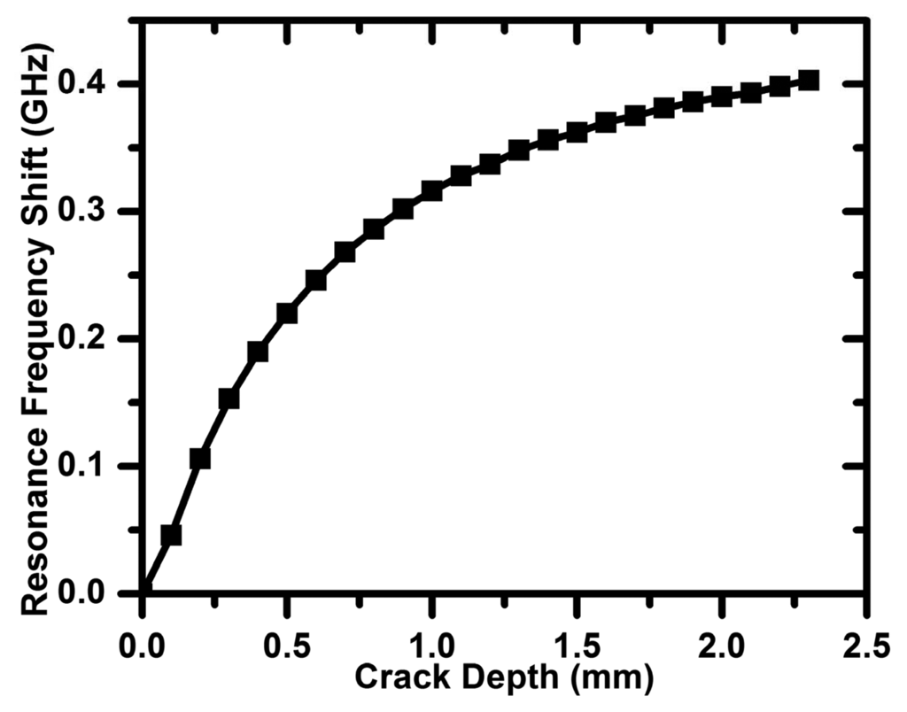 Inspection for surface and subsurface cracks in metallic and non-metallic materials is critical for quality assessment and maintenance. Microwave techniques have been proposed and utilized for crack detection. In [8], an open-ended waveguide operating at around 20 GHz was used as a microwave technique for crack detection in metallic materials, where a 840 μm wide surface crack was detected by direct correlation with the change in the reflection coefficient. While capable of detecting sub-millimeter cracks, the waveguide gives rise to a small perturbation in the near field, leading to small changes in the reflection coefficient; thus, the demand for higher accuracy was needed [9]. In [10–12], methods were introduced to increase the sensitivity of open-waveguide sensors. In [9], the detection of micro-scale cracks measuring 200 μm in width in steel plates were studied using near-field microwave dual-behavior resonator (DBR) filters, where a frequency shift in the resonance frequency indicated the presence of a crack. In the DBR technique, two filter probes were used with operating frequencies of 13.577 GHz and 8.008 GHz. The sensor exhibited resonance frequency shifts between 39 and 51 MHz. However, the changes in the resonance frequencies were small, indicating low sensitivity. In addition, the minimum transmission and reflection coefficient (indicative of the presence of a crack) was spread over a relatively wide band, which made finding the resonance frequency difficult, especially if the sensor were to be integrated in a stand-alone detection system rather than a high precision spectrum analyzer.
