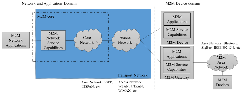 M2M Network and Application Domain: provides connectivity between the M2M gateways and M2M applications;