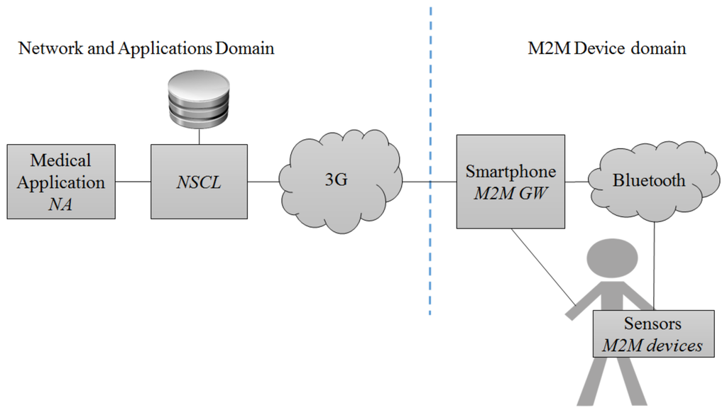 Smartphones are an ideal choice to play the role of a mobile M2M gateway in healthcare applications, as they are largely available to the population, are less resource constrained than specialized sensors, and have various connectivity alternatives. Although M2M communications have been thoroughly addressed for healthcare applications [13,15,26,38,39], most of the literature for healthcare still focus on BANs of sensors, and do not explore scenarios potentiated by the use of smartphones.