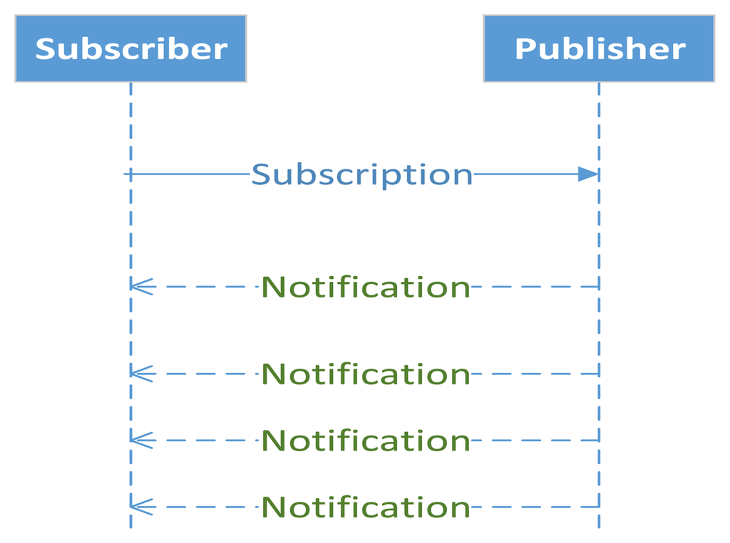 The messaging layer implements the publish-subscribe model. This part of the protocol extends the CoAP core protocol with a mechanism for a CoAP client to constantly observe a resource on another CoAP entity, thus termed CoAP observer model [61]. This mode requires that each M2M entity has a client and a server. To use the same terminology as in publish-subscribe, from now on a client is a subscriber and the observation is a subscription. The subscription is made with an extended GET message. With the subscription, each subscriber that has an observation relationship with the event is notified by the publisher where it made the subscription, see Figure 3. In this model, the publisher also acts as a broker. As long as subscribers send acknowledgements of notifications sent in Confirmable CoAP messages by the publisher, the subscriber remains on the list of observers. If the transmission of a notification times out after several attempts or the subscriber rejects a notification using an RST message, then the subscriber is removed from the list of observers. The observer model follows a best-effort approach for sending new representations to subscribers because, if the network is congested or the state changes more frequently than the network can handle, the publisher can skip notifications for any number of intermediate states.