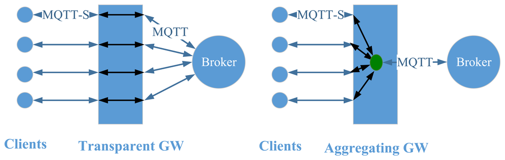 Figure 4 illustrates the concepts of transparent and aggregating gateway. A transparent gateway sets up and maintains an MQTT connection to the MQTT broker for each connected MQTT-S client. The gateway only performs translation between the two protocols. The implementation of this type of gateways is simpler than the implementation of an aggregating gateway. The use of an aggregating gateway requires only one MQTT connection to the broker. While connections at the transparent gateway are end-to-end (client to broker), connections with an aggregating gateway end at the gateway (client to gateway) that then decides which information will be given further to the broker [63]. Therefore, there is a trade-off between complexity and scalability of the gateways' implementation.