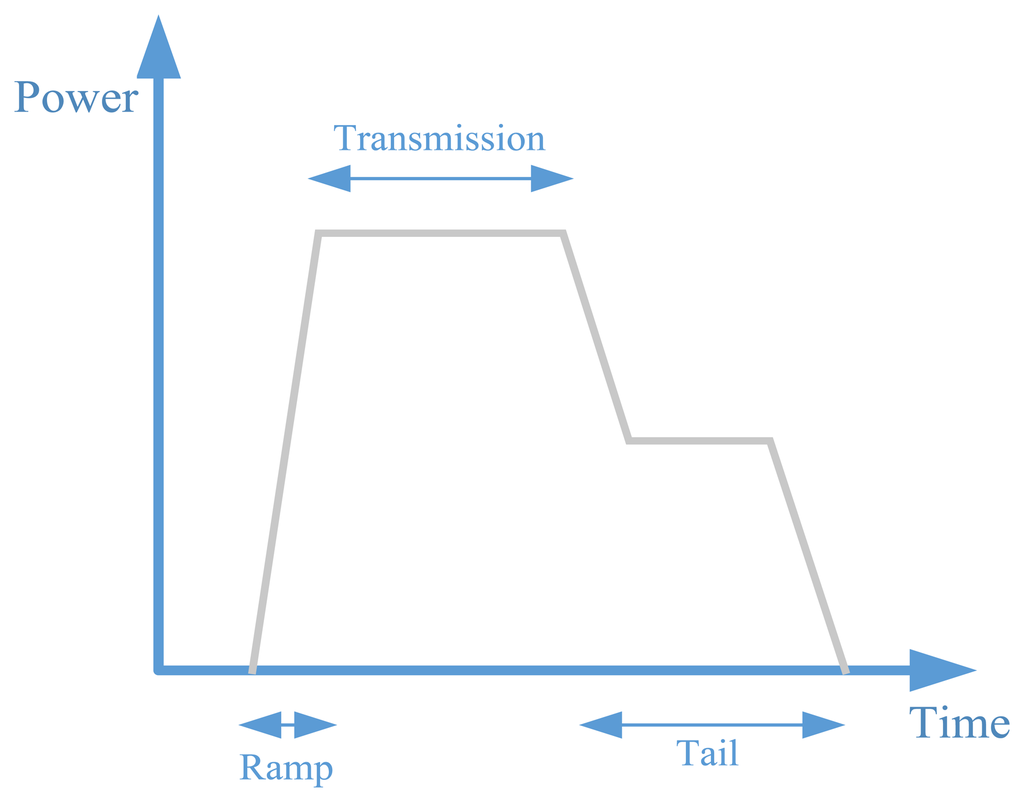 We seek to understand the feasibility of using a smartphone as an M2M gateway in terms of the energy consumption for forwarding data using a cellular network. The ubiquity and high data rates make cellular networks the most common choice for mobile M2M applications. As sensor data can be obtained using different short-range low-powered technologies, for the sake of simplicity, we exclude the data collection from the analysis. Nevertheless, we stress that obtaining the sensing data in an optimal way in terms of energy consumption is of extreme importance. For this study, we use the models for the average energy consumed for uploading data from a smartphone using a 3G network, obtained from [79]. Transmissions in 3G can be defined in 3 periods: the ramp, the transmission, and the tail, as can be seen in Figure 5. The ramp and the tail are transitions to and from high-power states where the actual transmission takes place, respectively. The time duration of the ramp is relatively small when compared to the actual transmission and the tail. However, the tail can last up to 12.5 s [79]. Still, if the data to be transmitted is large, or if the interval between successive transfers is small, the tail and the ramp do not impact the energy consumption significantly [79] when compared to the actual transmission.