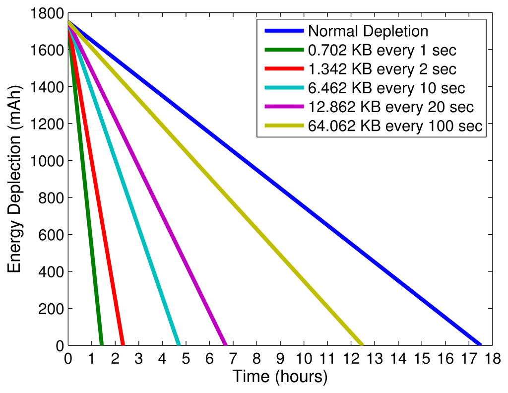 Please now consider the scenario where a smartphone collects data from several sensors to be forwarded, as depicted in our storyboard and in Figure 2. In this case, we assume that there is only one sensor collecting the heart rate from an individual and forwarding the data to a smartphone. From Table 3, we can conclude that, in each second, the sensor generates approximately 0.64 KB of data. The smartphone has to transmit this data through 3G and needs to append protocol headers and likely execute security mechanisms. We assume the use of CoAP application protocol, no header compression, and that each transmission includes a fixed overhead of 62 B to the useful data: 10 bytes for a common CoAP confirmable request [54], 13 bytes for DTLS per packet [54], 8 bytes for the UDP header, 20 bytes for the IP header, 2 bytes for the PDCP header, 5 bytes for the RLC and MAC Headers, and 4 bytes for CRC [82]. The data can be forwarded as 0.702 KB every second, 1.342 KB every two seconds, 6.462 KB every 10 s, and so forth, depending on the aggregation chosen. Figure 6 depicts the battery depletion of the smartphone for different transmission rates using 3G. Due to the scale in hours of the x axis, it is not possible to visualize the changes in slope when transmissions occur. The results show that only for larger aggregations of transmitted data, 64 KB every 100 s, we can achieve a full day, e.g., 08:00 – 20:00, of battery operation. We conclude that frequent transmissions of small size data will have an undesired effect in the expected depletion time of a smartphone's battery in mobile M2M communications scenarios. In order to use smartphones as M2M gateways, it is a good advice to maximize the collection of data necessary to be forwarded from nearby sensors, and maximize the intervals between transmissions. More research is required to devise energy efficient transmission methods that enable the use of smartphones as mobile gateways. Techniques such as transmission scheduling, header compression, data aggregation, or leverage heterogeneous networks can enhance smartphones' capabilities acting as gateways while easing their energy consumption problems.