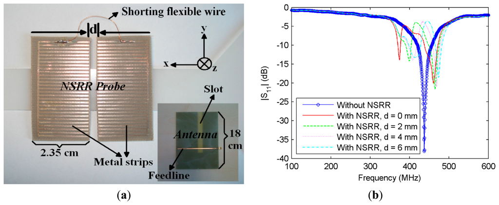 Recently, a displacement sensor, which comprises a metamaterial-based probe and an antenna transmitting/receiving power to/from the probe has been devised by our group [22]. The metamaterial-based probe is a modified version of the comb-like nested split ring resonator (NSRR) geometry, first proposed in [23]. This geometry is made of several pairs of metal strips in parallel (teeth) used to tune the operation resonance frequency by altering the effective capacitance of the sensor. The comb-like NSRR geometry used in this work is shown in Figure 1a. Details related to the design and physical dimensions are explained in [22]. The NSRR probe is located in the near-field of the microstrip single-slot antenna (shown in the Figure 1a inset and Figure 2a), inspired by the design given in [24]. Together, the NSRR probe and the antenna constitute a coupled system, whose resonance frequency changes with the displacement (d) on the NSRR probe. The frequency peaks shifting with d of the two parts of the NSRR are shown in Figure 1b. The strong coupling is due to the excitation method of the NSRR probe. Since the slot antenna is excited through a microstrip line along the x-direction at the back side of the substrate (see Figure 1a), it transmits an x-polarized E-field from the slot introduced at the other side of the substrate. When this field illuminates the NSRR, a strong coupling forms between the antenna and the probe, because the splits between the metal strips of the NSRR probe are also along the x-direction. When the antenna polarization is changed, e.g., when the antenna is rotated 90° around the z-axis, the resulting polarization yields lower depth resonances and a changed resonance frequency, due to much poorer coupling. Therefore, the antenna orientation must be set accordingly with respect to the NSRR probe position. The system shows no hysteresis, and each resonance frequency corresponds to a specific displacement level, so a one-to-one mapping between the displacement and the frequency shift is viable. An important feature of the sensor is that the NSRR probe is separated into two movable parts that are electrically shorted by a cable on the upper outermost tooth (shown in Figure 1a), which makes the sensor free of the necessity of strain propagation to the chip, and thus, the sensor is not bounded by the strain limits dictated by the elastic modulus of the NSSR probe material. Since we select the initial separation between the two parts of the NSRR, we can also acquire the strain information by either calculating it from the measured displacement or by using a calibration with strain gauges performed before the installation of the sensor. The maximum monitoring distance, Dm, which is the distance between the NSRR probe and the antenna, is observed at around 80 cm in the experiments. However, as expected, as Dm is increased, the resonances become harder to detect and the distinguishability is reduced.