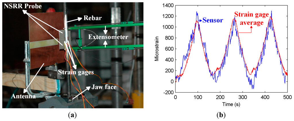 In a real-life scenario, it is frequently the case that a concrete cover is present between the antenna and the sensing structure located on the rebar, which is the NSRR probe in this study. It has previously been shown that concrete attenuates the RF signals due to its loss factor [25,26]. To see the sensor performance in this case, a concrete block of 4 cm in thickness, which represents the typical clear cover of a reinforced concrete member, is placed between the antenna and the rebar on which the NSRR probe is attached, and the linear region strain measurement is repeated. The force applied by the setup is increased linearly from 0 to 900 kgF and again decreased to a zero in one cycle. The measurement setup and the microstrain obtained by the sensor and the strain gauges when the concrete block is placed between the antenna and the probe are shown in Figure 3, respectively. It is observed in Figure 3b that the sensor can still track the strain in the presence of the concrete throughout the whole range, despite the degradation of sensor resolution due to the increased level of noise. The data of Figure 3b is the raw data from the measurements, where no post-processing is applied to exhibit the worst case scenario due to noise. Fluctuating components can be eliminated by several methods, e.g., simply by averaging or employing a low-pass filter. The calibration method used in the transformation of the frequencies to strain is the same as the case without the concrete. A successful transformation using the same calibration for the no-concrete case also proves that a typical concrete cover does not constitute a significant attenuation on the near-field interaction between the antenna and the NSRR probe. This is a promising result, especially when it is considered that this scenario includes the effects of both the rebar and the concrete block on the sensing system. In a real-life scenario, the effect of the concrete cover and the reinforced concrete behind the NSRR on the sensor will be in the form of decreasing the resonance frequency of the coupled system even further by the large capacitance brought in by this medium, which is an amplified version of the case of introducing a single rebar. This effect can be dealt with by employing different calibrations for each medium. This way, a different strain-frequency shift mapping is obtained for each case.