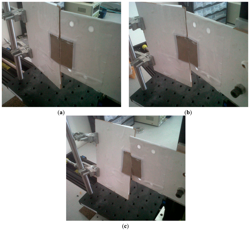 The robustness of the wireless metamaterial-based sensor is also tested on a translation stage to identify to what extent possible misalignments affect the readings. Among these misalignments are bending of the front faces of the two NSRR parts (faces with metal strips) towards each other (inward bending, see Figure 5a) and away from each other (outward bending, see Figure 5b). Yet another possible type of misalignment is twisting of the rebar, which causes the two NSRR parts to rotate in opposite directions around the rebar (see Figure 5c). In Figure 6a, the frequency shift of the sensor on the translation stage versus a created NSRR displacement (d) is presented for the cases when there is no misalignment and when there is an inward bending with the angles of 5°, 10° and 15°. The same characterization is shown for several angles in the case of outward bending in Figure 6b and in the case of twisting in Figure 6c.