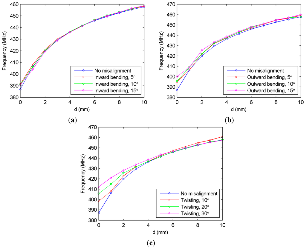 The first two figures show that the bending of the NSRR parts does not have a major effect on the sensor operation, since the curves obtained for these misalignments are no different than that without misalignment. The only possible discrepancy is experienced when d = 0 mm for the outward bending, since the resonance frequency difference between the case of no misalignment and the case of 15° bending is observed to be over 10 MHz. For twisting, the resulting deviation from the case of no misalignment is higher for smaller displacements, but as d increases, this deviation is reduced. It should also be emphasized that the angles of 10°, 20° and 30° are actually fairly extreme angles for such a twisting in practice, and they were selected to test the worst possible cases. Nevertheless, especially for d = 0 mm, the resonance frequency difference between the cases of no misalignment and twisting is quite high. This problem can be addressed by allowing an initial separation (d) between the two NSRR parts, e.g., 1 mm, and choosing this as the starting displacement. Although this comes at the cost of reduced sensitivity and dynamic range of the sensor (which is still quite high), it increases the robustness.