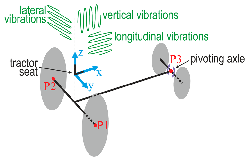 The tractor chassis is joined to the tractor at three points: at the left end of the rear axle, at the right end of the rear axle, and at the midpoint of the pivoting front axle. Due to this pivot feature of the front axle, the passage of the front wheels over uneven terrain will not expose the driver to lateral vibrations. The front-axle suspension system of a tractor helps to ensure stable driving and to reduce the pitch, but it has little influence on the amount of lateral vibrations experienced by the tractor driver.