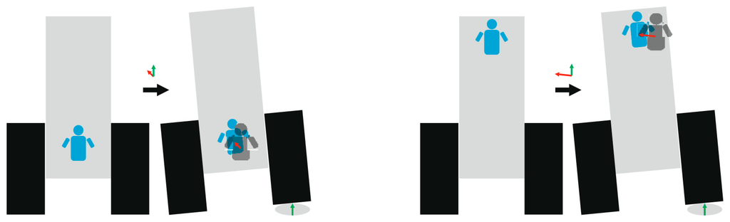 Tractor-seat height above the ground is one of the factors that influence the magnitude and the type of vibrations received by the driver. Figure 2 depicts this influence in a simplified model, in which we consider two situations. In the first situation, seat height over the ground is low and uneven terrain produces vibrations in the tractor that are transmitted to the driver, mainly in the form of vertical vibrations. The second is when tractor-seat height over the ground is high and uneven terrain produces vibrations that are transmitted to the driver mainly in the form of vertical as well as lateral vibrations.
