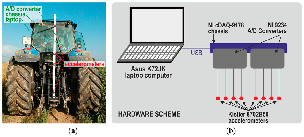 Eight Kistler 8702B50 piezoelectric accelerometers were employed. Their key specifications were an acceleration range of ±50 g, a sensitivity of 100 mV/g, and a frequency range of 0.5–10,000 Hz. Accelerometers were connected to two National Instruments 9234 four-channel A/D converters with anti-aliasing filters, the key specifications of which are 51.2 kS/s and 24 resolution bits. These converters were inserted into a National Instruments cDAQ-9178 chassis, which was connected to an Asus k72jk notebook with a Microsoft Windows 7 Home Premium 64-bit operating system. Figure 3 presents the placement and connection of the elements employed in the real tests of this study.
