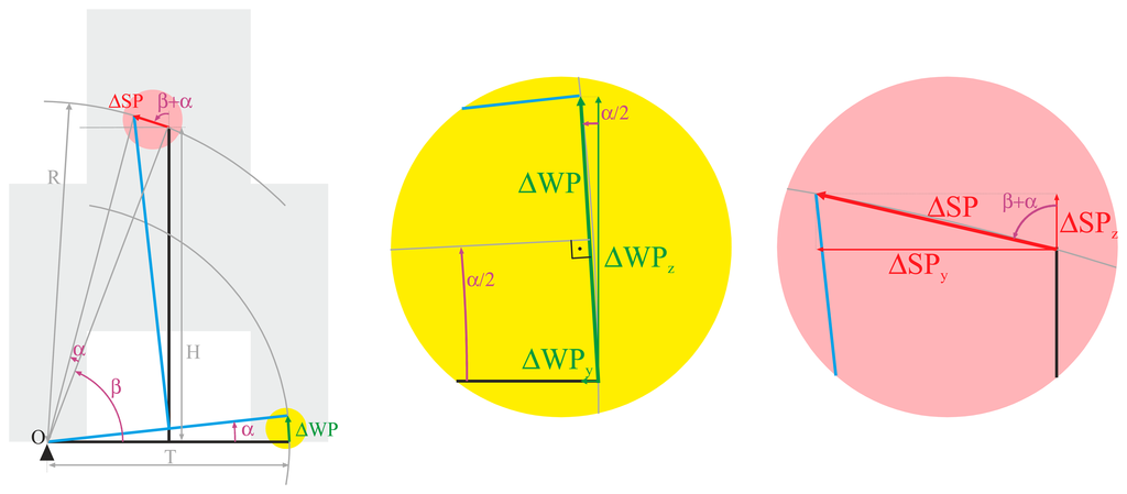A ΔWPz vertical displacement of one tractor wheel produces two displacements of the tractor seat, a vertical one on the Z axis, and another lateral one on the Y axis. Taking into account the parameters presented in Figure 4 and the trigonometric functions, the vertical and lateral displacement of the tractor seat, ΔSPz and ΔSPy, can be computed as a function of the vertical displacement of one tractor wheel, ΔWPz, as follows: