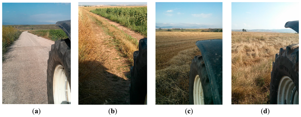 Four sets of vibration data were acquired in Aguilar de Bureba, Burgos, Spain. The first one was acquired on a paved road (Figure 5a), the second, on an unpaved road (Figure 5b), the third on a cultivated plot (Figure 5c), and the forth on an uncultivated plot (Figure 5d). On each type of ground, acceleration signals were acquired for five minutes with the eight accelerometers at a rate of 5000 samples per second. The tractor moved over the four surfaces at a constant speed of 8 km/h.