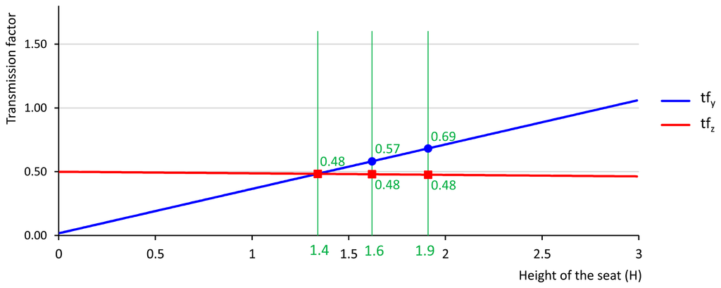The geometrical study described in Section 3.2.1 proves that the lateral vibrations to which a tractor driver is exposed increase linearly with height, if we consider the tractor as a rigid solid without inertia, because the transmission factor over the y-axis (tfy), displayed as a red line on Figure 6, increases linearly with H, the height of the tractor-seat above the ground.