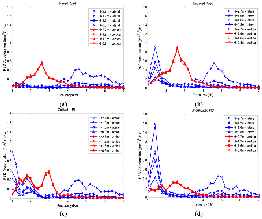 The 2.4 m value for the paved road, the 2.5 m value for the unpaved road, the 2.2 m value for the cultivated plot, and the 1.7 m. value for the uncultivated plot are threshold values. At these heights, mean acceleration in the 1–7 Hz frequency band is the same for both the vertical and the lateral vibration components. Below these heights, the vertical vibration component is greater than the lateral vibration component. And above these heights, the lateral vibration component is higher than the vertical vibration component.