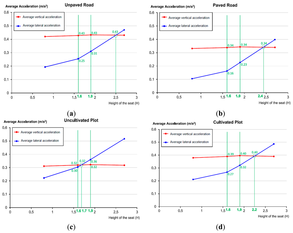 Figure 8 is presented so that we can graphically perceive the evolution of the mean acceleration of the vibrations falling in the 1–7 Hz frequency band in relation to tractor-seat height above the ground. The graphs in this figure are generated by using data from Table 1. According to Figure 8: