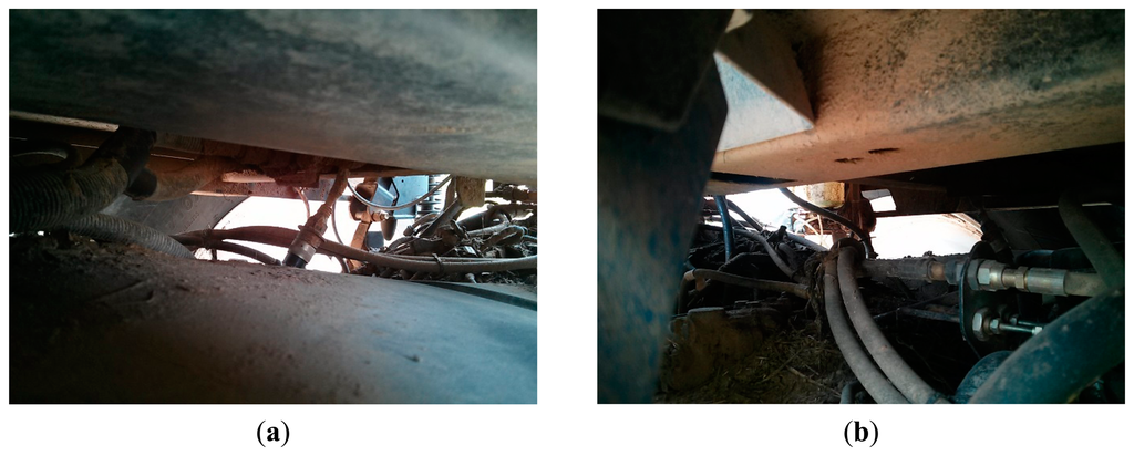 The tractor geometry design implies a trade-off between driver visibility, constructability, weight distribution, pulling capacity, and aesthetic considerations among others tractor features. A large reduction of the height of the tractor-seat above the ground might reduce driver visibility and will complicate the design process of the tractor. However, it is the authors' opinion that a reduction of 30 cm, for example, in medium-size tractors, equal to 15%, is feasible, easy for tractor manufacturers to achieve, and would hardly effect driver visibility. Figure 9 show two photos of the space under the cab of the tractor tested in this article. The presence of a lot of space in these photos suggests that a 30 cm reduction of tractor-seat height above the ground could be feasible and simple to achieve.