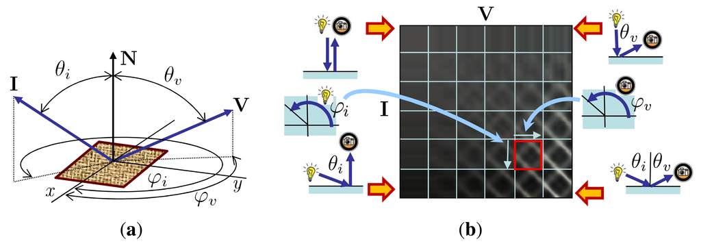 Each BTF can be viewed as a collection of pixel-wise apparent BRDFs (ABRDFs), which do not follow the BRDF properties due to non-local effects in a material structure like shadowing, masking, etc. If we process individual color channels separately, each pixel’s ABRDF can be represented by a four-dimensional function ABRDF(θi, φi, θυ, φυ). ABRDF is the most general data representation of material reflectance dependent on local illumination I(θi, φi) and view V(θυ, φυ) directions. Its typical parameterization by elevation θ and azimuthal φ angles is shown in Figure 1a. ABRDF can represent dependence of view and illumination directions of a single BTF pixel. A projection of the 4D ABRDF by means of a 2D image is shown in Figure 1b. Note that individual rectangles (an example is shown in red) represent 2D subspaces of a 4D ABRDF at constant elevations (θi/θυ). These subspaces are toroidal. That is, data of the highest φ ≈ 2π are followed by data of the lowest φ ≈ 0.