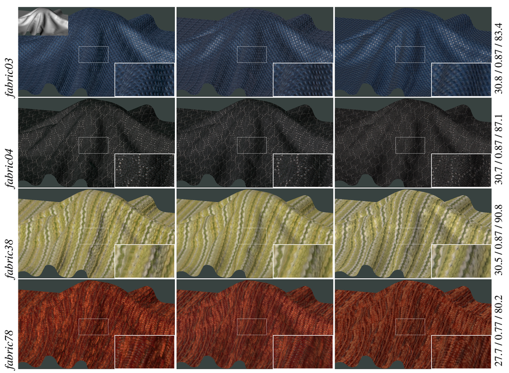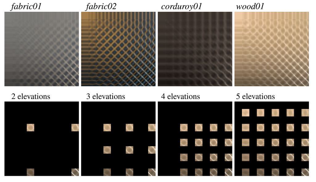 Lower sharpness of structure details – results from geometrical deformation of the structure’s features, which is caused partly by mechanical vibrations during the measurement and partly by very sparse sampling of the azimuthal space, as well as by interpolation of the data at missing elevations. The interpolation causes blurring due to improper highlight extrapolation for low elevation angles. Another reason for the lower contrast is a low dynamic range of the camera sensor, where certain details are lost after the exposure compensation (e.g., white dots in fabric04); therefore, a sensor with a dynamic range over 8 bits/channel would help.