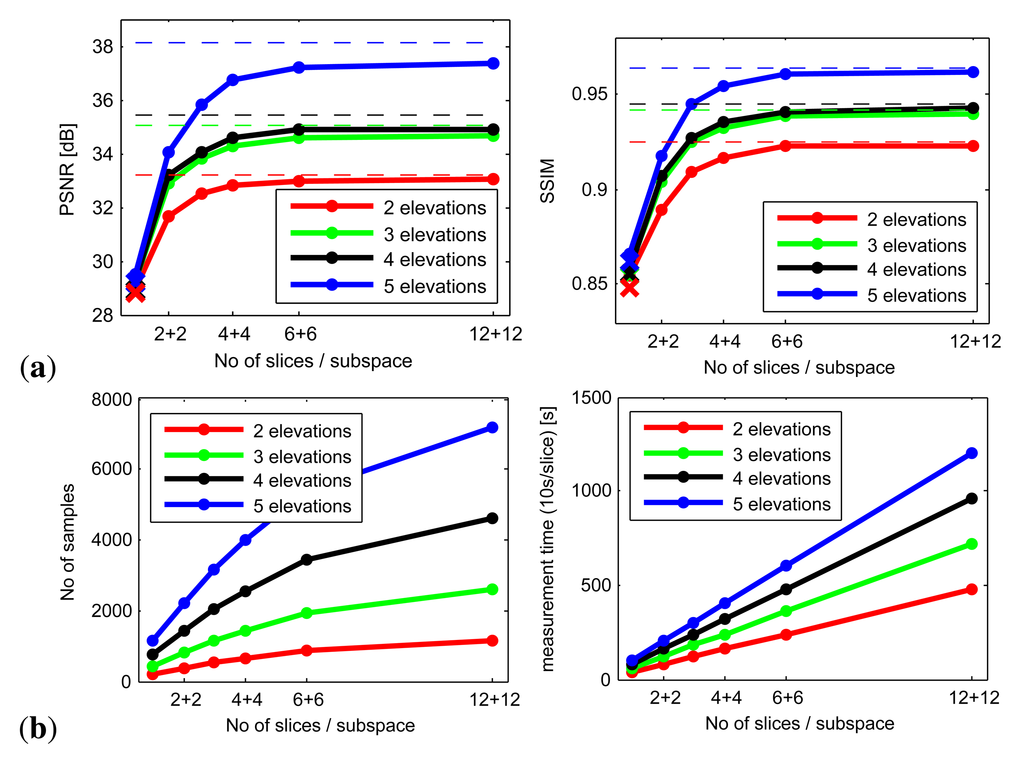 We analyzed reconstruction performance for four different combinations of elevations where the subspaces were measured: two (30° and 75°, used in this paper), three (30°, 52.5°, 75°), four (30°, 45°, 60°, 75°), and five (15°, 30°, 45°, 60°, 75°) as shown in Figure 10-bottom.