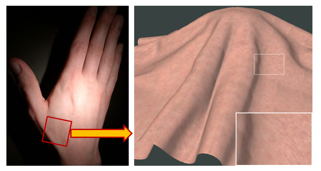To demonstrate the speed and portability of our acquisition procedure (using 2 illumination and 2 view elevations) we recorded and reconstructed BTF of skin on the author’s hand (Figure 12). Although there is present a certain blur caused by slight movement of subject’s hand during the five minute measurement, note that such a measurement would not be possible, due to long measurement times or a setup design, by any BTF acquisition method presented so far. Compared to [12] our approach is not constrained by the BRDF properties, i.e., we can also record rougher, non-opaque materials.