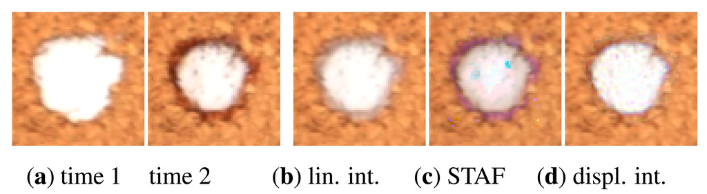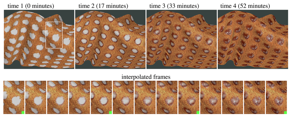 Then we tested three interpolation methods: linear interpolation (applied to TVBTF in [20]), space-time factorization (STAF) [12], and displacement interpolation [21] as shown in Figure 14. As expected, the linear interpolation was fastest, but introduced artifact blur effects at the regions where the glue area shrinks. The STAF algorithm performed significantly better, however, it is sensitive to careful setting of initial conditions as it performs per-pixel non-linear fitting. Finally, we tested the displacement interpolation (DI) solving a generalized mass transport optimization problem. In contrast to the STAF algorithm modeling spatial-temporal dynamics of the entire time-sequence, the DI algorithm performs weighted interpolation between only two images. Due to its stability we resorted to a DI algorithm and applied it to interpolation between two sets of 208 images representing two time frames in TVBTF. The second row in Figure 13 shows the obtained smooth transitions between measured time-frames illustrating illumination and view-dependent effect of glue desiccation over one hour (the measured time-frames are marked by green square).