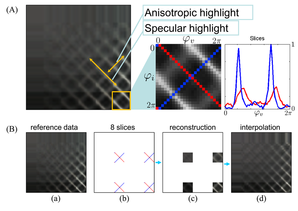 In this paper, we use ABRDF reconstruction from sparse data proposed in [13]. This method is based on two perpendicular slices measured across azimuthal angles for fixed light and camera elevations as shown in Figure 2A (red and blue). As the slices are perpendicular to anisotropic (the red one) and specular highlights (the blue one) they bear enough information to approximate azimuthally-dependent behavior of the ABRDF.