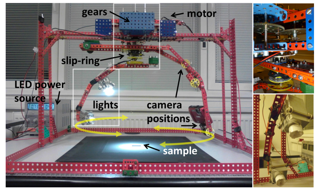 The setup realizing measurement of the BTF slices is shown in Figure 3. It consists of a mechanical gantry holding two arms rotating synchronously in either the same or opposite direction. The gantry was built using a Merkur toy construction set ( http://www.merkurtoys.cz/en/). Contrary to its initial version presented in [13], requiring manual movement of the arms, we use a more reliable solution with a single DC motor (4.5 V) run at a constant speed. Using additional gears guarantees accurate arms synchronization and allows us to switch the mutual rotation directions of the arms (see Figure 3-top-right). One of the arms holds two LED Cree XLamp XM-L light sources with 20° frosted optics (see Figure 3-bottom-right). Contrary to the original design we improved arms weight balancing and added a rotation slip-ring to avoid clumsy LED power supply (0.7 A/3 V) wires. The second arm has two positions for attachment of a Panasonic Lumix DMC-FT3 camera. One advantage of this camera is that it does not have a protruding lens, which could possibly block the arm bearing the lights. Elevations of the LEDs and camera in both positions are fixed at 30° and 65°. The setup can be constructed in 10 h, for less than $350 and can hold almost any compact camera. The setup’s dimensions are 0.6 × 0.6 × 0.4 m, with a weight of 6 kg. The frame holding the rotating arms can be folded down on the support platform, so the setup’s size can even be reduced to allow easy transportation and the use for field measurements of samples that cannot be removed from their environments.