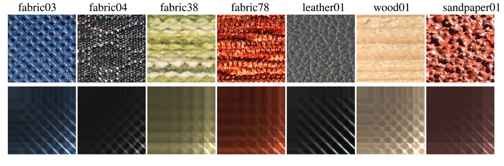 We selected different types of materials for measurement as illustrated in Figure 5: non-woven fabric (fabric03), upholstery with a height profile (fabric04), woven fabric (fabric38), and corduroy-like upholstery (fabric78), artificial leather (leather01), raw wood (wood01), and rough sandpaper (sandpaper01), most of them highly anisotropic as is clear from their spatially averaged ABRDFs shown in the second row.