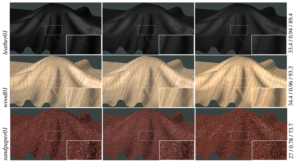 These images show a close resemblance of both results to the reference data. The main difference between them is in color hue caused by differences in the acquisition processes as discussed in Section 6. Smoother appearance of the material wood01 results from variations in the amount of sanding that has been performed on the raw wood surface. Note that, although we use the same materials as the reference measurement system, we cannot achieve pixel-wise alignment between the reference and the proposed measurements. Therefore, the accuracy of the proposed method cannot be assessed by any of the standard pixel-wise quality evaluation metrics. This type of comparison is possible only between data in the first two columns. The difference values for PSNR[dB], SSIM, and VDP2 are shown on the right sides of the images.