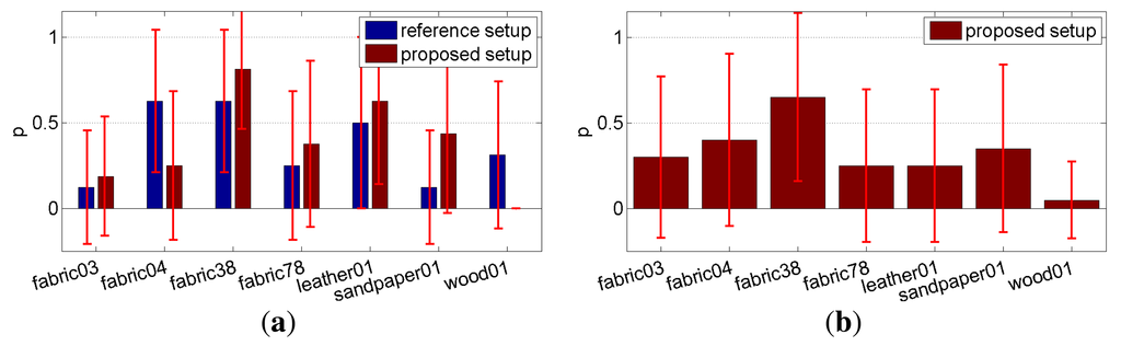 Experiment 1 – Eight naive subjects compared difference between reference and sparsely sampled BTF representations. Subjects were shown two rendered images on a calibrated screen together with actual specimens of materials as shown in Figure 5. The question was: Which of the two images looks more realistic? When we compared the renderings of complete and sparse reference data (the first vs. second column in Figures 6 and 7), on average, 37% of our subjects preferred those from the sparse reference data, and when we compared renderings of complete reference data with our sparse measurements (the first vs. third columns in Figures 6 and 7), 38% of our subjects preferred those from our data. The results for individual materials are shown in Figure 8a. Interestingly, for materials fabric38, fabric78, and sandpaper01 scored the proposed measurement method much better than sparse reference one. Note that the difference for material wood01 is a result of a slightly different specimen of the same material, with a smoother surface finishing.
