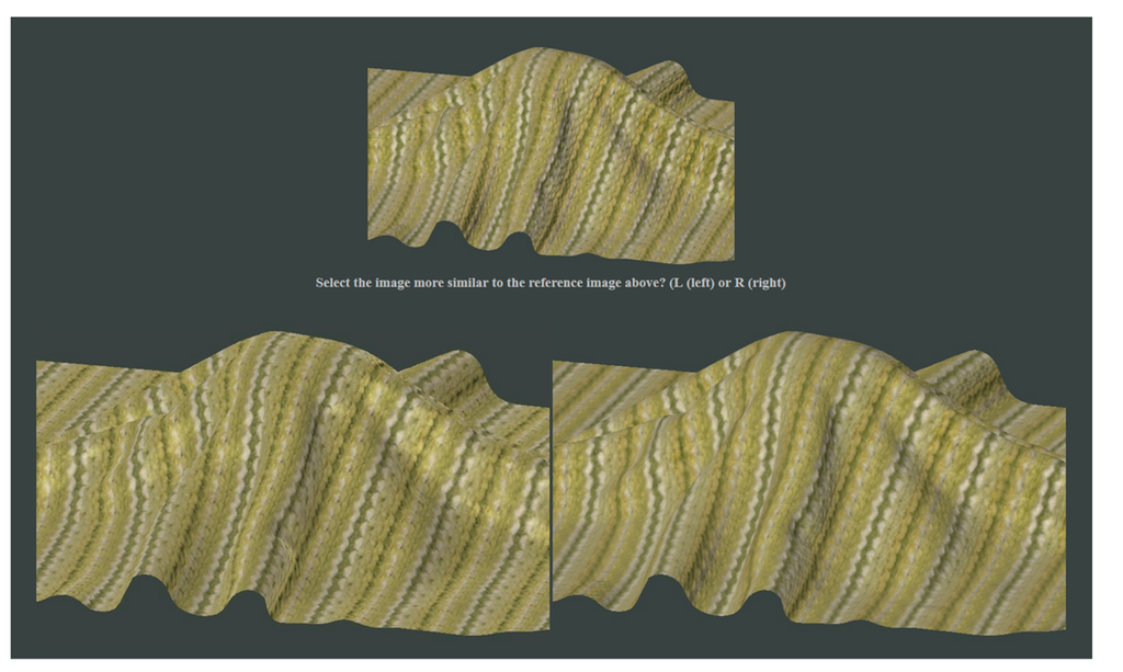 Experiment 2 –To determine error resulting from the proposed simplified acquisition technique when compared to sparse reference measurement, we ran another perceptual study with 20 subjects. For each tested material they were shown reference measurements rendering using a complete set of 6561 BTF images and were asked to choose between the two sparse measurement options using 208 images only (obtained using the proposed and reference setups). An example stimulus image is shown in Figure 9; subjects were asked: Select the image more similar to the reference image above. We used a website-based interface, and image couples were ordered randomly. Subjects were encouraged to consider a overall appearance instead of focusing on local details. To avoid the latter we reduced size of the reference image. Analysis of responses revealed that on average, only 32% of subjects considered the results from the proposed setup more similar to the complete reference data (see Figure 8b), while 68% of subjects preferred data from the reference setup. When material wood01 is excluded (as explained above) the ratio becomes 38%:62%. Although the lower value likely resulted due to similarity of the complete reference dataset to its sparse subset (both sharing the same acquisition process, i.e., color hue, texture tiles), the result is encouraging, especially when considering the relatively high standard deviation of subject responses shown as errorbars in Figure 8b.