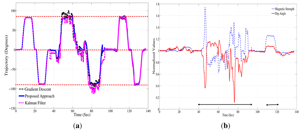 The method was tested in dynamic experiments with a moving AHRS. The AHRS was mounted on a rotating platform that allows ±360° rotations along three orthogonal axes. The platform was rotated ±90° along all three axes. This motion was chosen, because it mirrors a basic template of rehabilitation exercises in which a patient performs repetitive flexion-extension of the arms. Figure 10a shows the results of the experiment. Magnetic distortion was introduced during the motion by placing a PC speaker close to the rotating platform between the 40th and 90th second (approximately a 10-cm distance from the speaker). The Earth's ambient magnetic field is distorted in the presence of the speaker. Figure 10b shows the normalized value for magnetic strength measured by the magnetometer. It can be seen that during magnetic distortion, the magnetic strength and dip angle change. The intervals in which distortion were introduced is depicted by arrows in Figure 10b. The result of the proposed approach was compared to the gradient descent approach proposed by Magdwick [18] and to the Kalman filter approach in [7]. Table 2 enumerates the RMS and the maximum peak-to-peak errors observed during our experiments. The maximum peak-to-peak error was less than 5° (3.4° RMS) on the trajectory estimated by the proposed approach, whereas the gradient descent approach showed a maximum error of 10° (6° RMS); the Kalman filter approach showed an error of up to 12° peak-to-peak (9.26° RMS); and the uncompensated trajectory had error of up to 23° (15.4° RMS). It should be noted that the values of the error are dependent on the type of ferrous material and the orientation of AHRS with respect to the ferrous material.