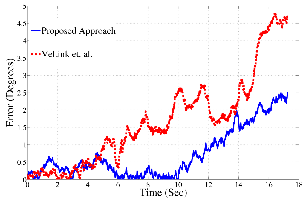 The proposed algorithm was tested under various speeds of AHRS motion. In accordance with a study that reports the range of acceleration during a sit-to-stand exercise [21], the algorithm was tested by carrying out pitch, yaw and roll rotations with accelerations ranging from zero to 3.5 g (where g = 9.8 m/s2). The acceleration reported here is the total magnitude of the acceleration measured by the accelerometer. Figure 11 compares the heading results for a experiment in which the AHRS was moved at 3 g. Due to the high acceleration, the inclination estimates were corrupted with noise. The approach used for fast accelerations is compared to a Kalman filter approach [22], which measures inclination under various ranges of accelerations of the human body. This approach was chosen for comparison, because it specifically models the accelerations using an auto-regressive process. Under conditions of fast acceleration, the proposed approach outperforms the candidate Kalman filter approach. The Kalman filter error is up to 5° in 20 s, whereas the proposed approach shows an error of 2°. Thus, the proposed approach is more robust to accelerations typically encountered during human body rehab movements.