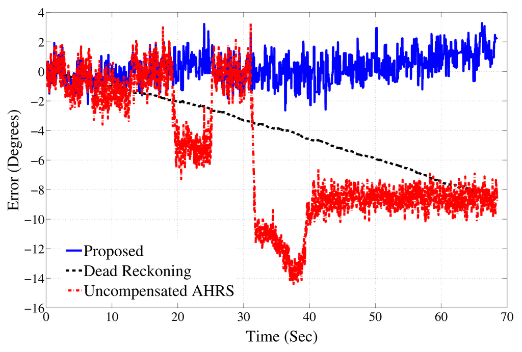 The particle filters are applicable to systems with any error model. Herein, we chose to compare the proposed approach with the gradient descent approach [12] and the autoregressive model-based Kalman filter approach [7], since these approaches and their variants are used widely for magnetic distortion compensation.