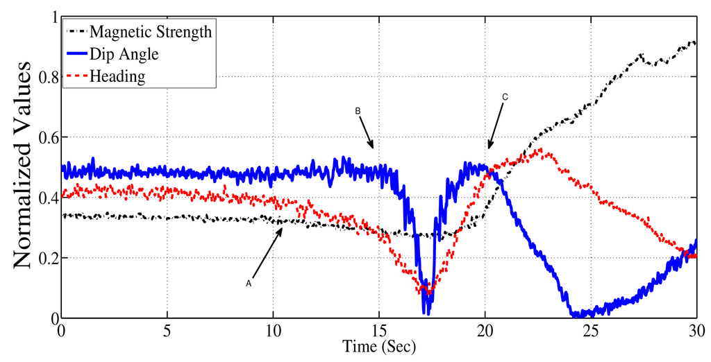 In an experiment, a three-axis magnetometer was kept static and a ferrous object was moved gradually towards the magnetometer. The movement was linear in a horizontal plane. Figure 2 shows the measurements as the ferrous object moves towards and past the magnetometer (starting from one meter north of the magnetometer and ending one meter to the south of the magnetometer). It is evident from the figure that the the heading estimate is affected first; slowly, initially, but significantly after the 12th second (Point A in the Figure 2). The dip angle is impacted second, after the 15th second (Point B). Finally, the field strength is significantly changed after the 17th second (Point C). If an algorithm were to rely solely on the change in magnetic field strength, then the presence of the disturbance would be undetected or detected late in such circumstances. Thus, it is desirable to use both magnetic dip angle and magnetic strength to detect the presence of magnetic distortions.
