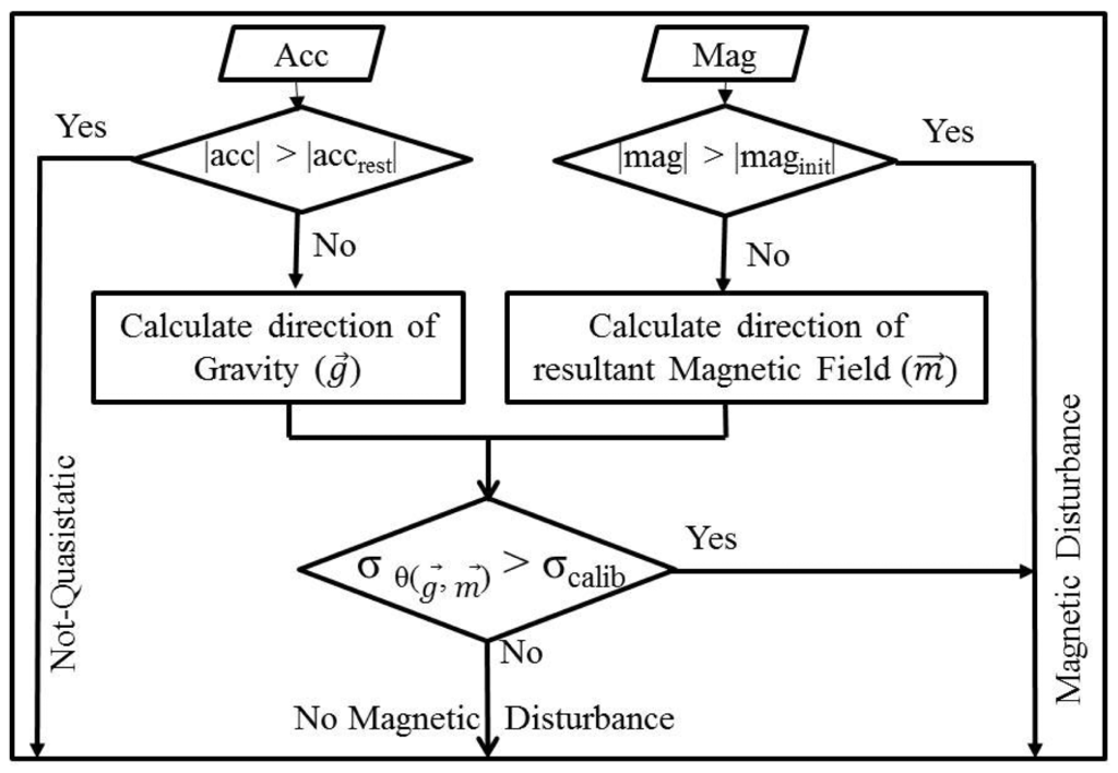 Figure 3 illustrates the proposed algorithm for detecting magnetic distortion. Both the accelerometer and magnetometer are used to derive the magnetic dip angle. The primary check for distortion detection is comparing the current magnetic strength (|mag|) to a prior threshold (maginit). The threshold is calculated by placing the AHRS in a magnetically clean environment (i.e., away from the magnetic/ferrous objects) for 5 s. The mean value over this period is used as the threshold. During the rest period, the floor noise of the magnetic dip angle (σcalib) is calculated.