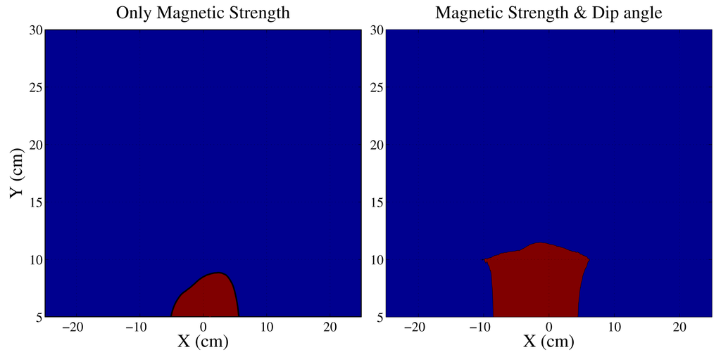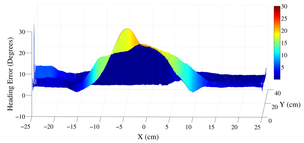 The method was verified experimentally by moving an AHRS in a linear trajectory across a magnetic object. A Shimmer magnetometer, consisting of a magnetometer, accelerometer and a gyroscope, was used for experiments [17]. The magnetometer was moved across an active desktop speaker. Figure 4 illustrates the magnitudes of the heading error, when an AHRS is moved 1 m from either side of the object in the X-direction (east-west). This linear X-trajectory was repeated at distances of −1 to 1 m in the Y direction (north-south) from the material. It is evident from Figure 4 that the heading error is observed when the object is at a distance of approximately 15 cm from the speaker. The distortions are significant when the AHRS is between −10 to +15 cm separation in the X-direction from the object. The proposed detection algorithm was applied to the AHRS data with and without the magnetic dip angle information. The results are shown in Figure 5. It is evident that the detection is more sensitive when using both the magnetic strength and magnetic dip angle.