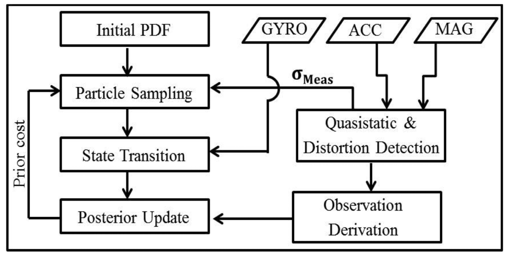 When performing sampling in the state space, no underlying probability distribution function is assumed, because the system is unaware of the direction and strength of magnetic distortions. Uniform distribution is assumed when particles are sampled. For sampling, the current gyroscope reading (ωi) is used as the mean value, and the standard deviation is the floor noise of the gyroscope (σω).