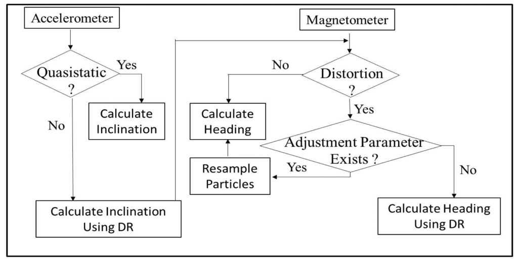 The measurement model is adaptive, and the outputs are based on the presence or absence of magnetic distortions in the sensing environment. Figure 7 illustrates the approach used for calculating heading and inclination under various scenarios. We will look at the two scenarios separately in the following subsections.
