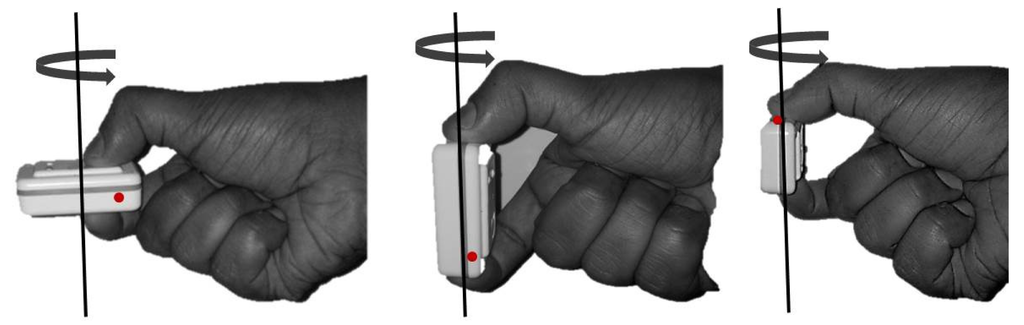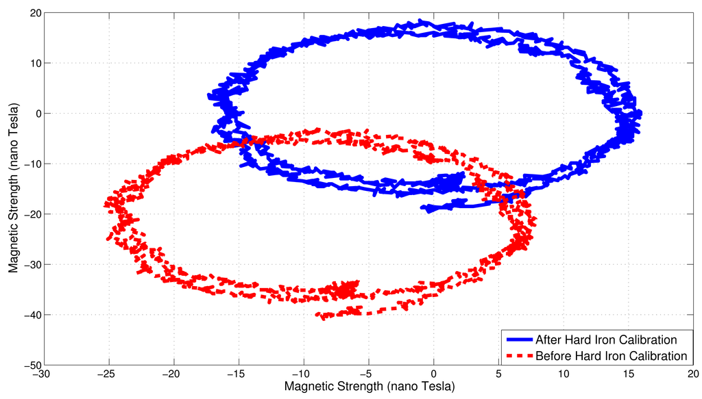 A nine DOF Shimmer sensor, consisting of a three-axis accelerometer, three-axis gyroscope and three-axis magnetometer, was used for experimental validation [17]. The motion capture environment was a typical indoor office space consisting of a desktop, office drawer, speakers and other materials in the vicinity. The AHRS data were sampled at 200 Hz and the data passed through a 50 Hz low pass filter. The captured data was processed in MATLAB (The MathWorks Inc., Natick, MA, USA). The Shimmer was calibrated for constant hard iron errors in the space. These constant hard iron errors are the additive magnetic fields that have a constant magnitude and direction at all times. The calibration was performed by means of a horizontal 360° rotation, as shown in Figure 8. Figure 9 shows the plot of horizontal magnetic strengths for two full rotations of the AHRS, before and after the calibration step. It is evident from the figure that the constant offset caused by the hard iron error is removed after the calibration procedure.