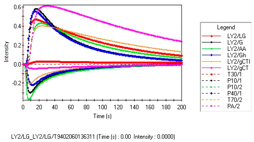 Figure 1 shows the typical signal of 12 sensors to sample GZM1. Each curve represents one sensor's conductivity induced by electrovalve action, when a volatile gas reaches the measurement chamber. The EN sensor response of samples, also called odor intensity, is calculated using the following expression [11]: