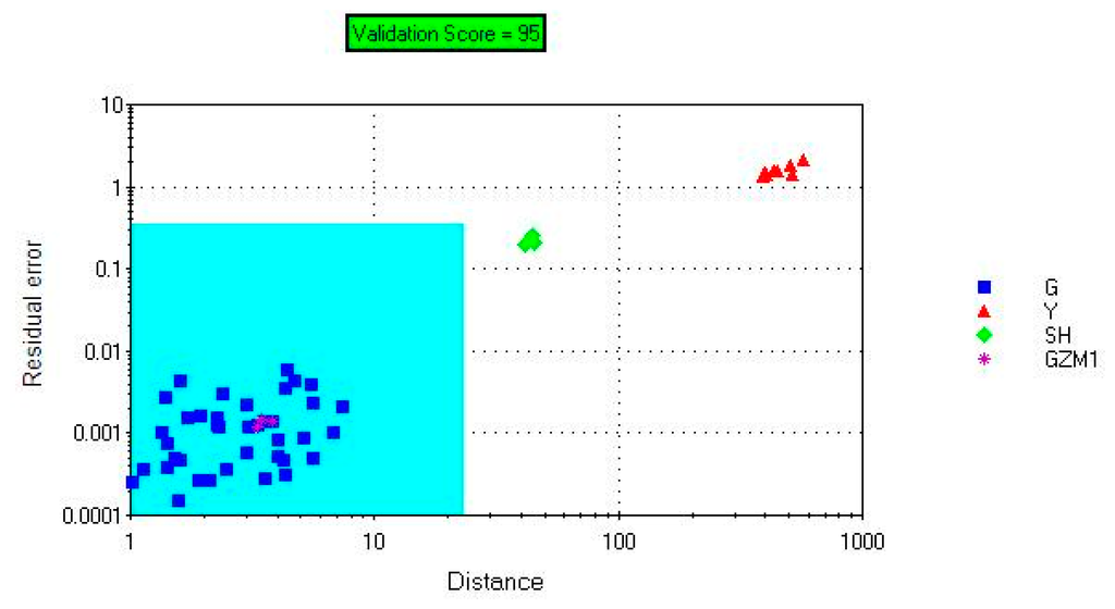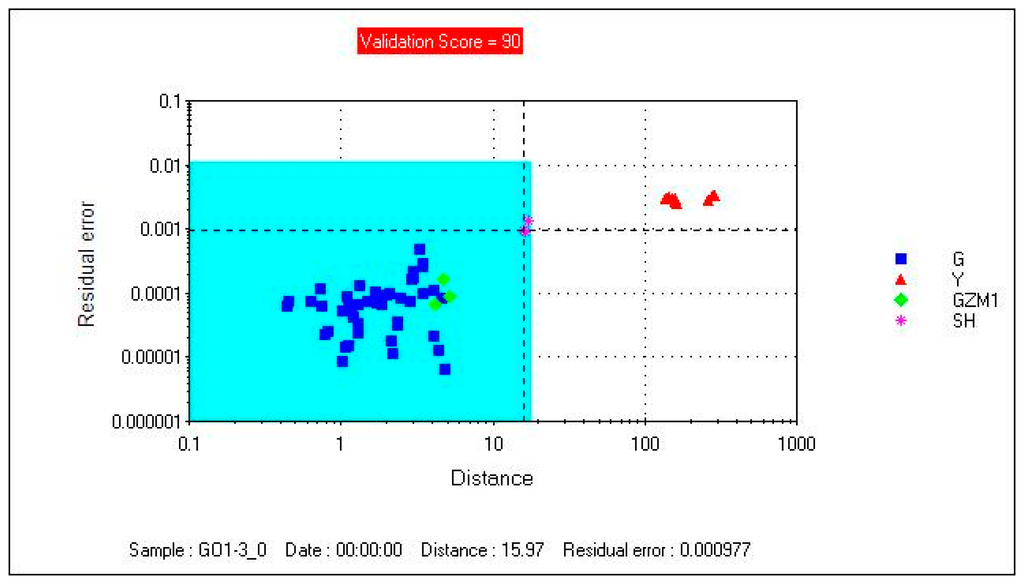 Figure 3 shows that the model's checking score was 98. The model separated the samples into two regions. The Gansu group was in the acceptable region, and the Yunnan group was outside the acceptable region. GZM1 and SH selected as the unknown samples were projected onto the model which showed that sample GZM1 was correctly project onto the acceptable region and sample SH was incorrectly projected onto the acceptable region. The results indicated that the model was not accurate enough for unknown samples. A more valid feature extraction method should be created.