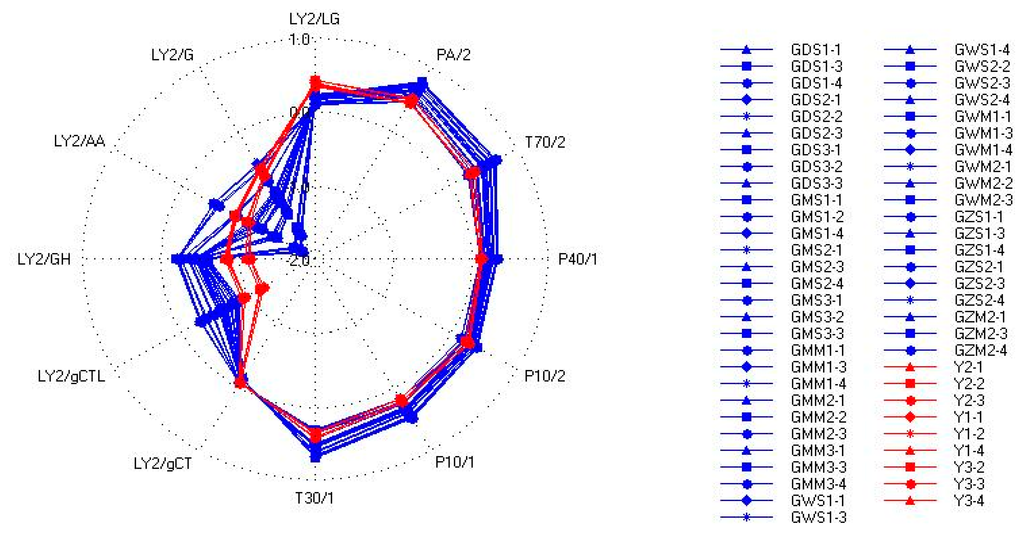 From above we can see that we can't distinguish Gansu group from Yunnan group successfully with FEM1, so a new feature extraction method should be created. To some extent, the maximum response of sensors may have some limitations in reflecting the characteristics of the TCM odors. Sensors are made up of different precious metals, platinum, palladium, rhodium, and SiO2 (coated by precious metals). The differences of metal materials and production processes may affect the response intensity of complex chemical components. The components and their absolute contents together determine the response intensity of each sensor. Due to the particularity of TCM, the same TCM may be seriously affected by many factors, which may make the differences in the absolute content of all kinds of aroma components big, then the response intensities of the sensors also have bigger differences. On the other hand, different odor characteristics are the reflection of aroma components which is the different combination of the amount and types of odors. The ratios between the odor components are important for the combination. Different metal oxide film sensors can sense different olfactory sensitivity components. The response intensity reflects the absolute content of the corresponding components and the amount of the volatile component can affect the absolute content of olfactory sensitivity components rather than the relative content. In a word, the ratios of the olfactory sensitivity components are relatively stable. Due to the fact metal oxide sensors have selectivity, the ratios of the different response intensities of sensors to some extent reflect the ratios of the olfactory sensitivity components. In this study we considered the maximum response for data processing and the inter-ratios of different sensors were calculated. Then we tried to combine the maximum responses of the sensors with their inter-ratios, which was called feature extraction method 2 (FEM2). Figure 5 shows the Radar plots for samples of the Yunnan group and Gansu group. It shows that the Yunnan group and Gansu group were nearly on the same track in the right part of the Radar plots where the positive reactions are shown, but in the left part where the negative reactions are reflected, the Yunnan group and Gansu group were not on the same track. The left parts indicated that there are many differences between them, so in FEM2, only the negative reactions data were calculated.