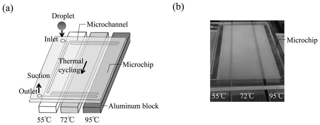The microfluidic device was designed to perform 40 thermal cycles for amplification. The PCR chip device was 80 mm long and 50 mm wide. The heater and cooler were composed of 15 × 10 × 100 mm aluminum blocks. The heat-transfer aluminum block contained a heat conductor and temperature sensor (Kyushu-Nissho Co., Fukuoka, Japan). The aluminum block for cooling was in contact with a Peltier cooling element (SPE-UC-100, E.H Sakaguchi Corporation, Tokyo, Japan). The chip device was placed on the aluminum blocks, and the PCR solution containing the target genes was introduced through the inlet with a syringe pump. The blocks were configured such that the PCR solutions passed through three different temperature zones repeatedly (Figure 1a,b). The aluminum block temperatures for extension and denaturation were set at 72 and 95 °C, respectively. The optimum temperature for the annealing zone was considered to be less than 60 °C. The PCR products were collected in microplate wells and their fluorescence intensities were detected with a fluorescence microplate reader (Fluoroskan Ascent, Thermo Scientific, Yokohama, Japan). The moving fluid was visualized by IR imaging using a thermal imager (Ti10, Fluke Corporation, WA, USA).
