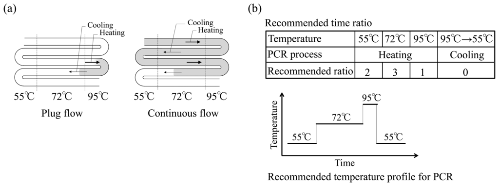 Easy-to-use thermal cycling for performing rapid and small-volume DNA amplification on a single chip has attracted great interest in the area of rapid field detection of biological agents. For this purpose, as a more practical alternative to conventional continuous flow thermal cycling, liquid plug-flow thermal cycling utilizes a thermal gradient generated in a serpentine rectangular flow microchannel as an actuator. The transit time and flow speed of the plug flow varied drastically in each temperature zone due to the difference in the tension at the interface between temperature gradients. According to thermal distribution analyses in microfluidics, the plug flow allowed for a slow heating process, but a fast cooling process. The thermal cycle of the microfluid was consistent with the recommended temperature gradient for PCR. Indeed, amplification efficiency of the plug flow was superior to continuous flow PCR, and provided an impressive improvement over previously-reported flow microchannel thermal cycling techniques.1. Introduction