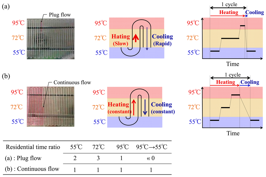 In continuous flow channel-based PCR, the system is composed of several temperature zones and a long micro-flow channel to carry PCR reagents to individual temperature zones, enabling high speed DNA amplification free from the influence of the heat transfer coefficient of the chamber material. However, most of the previously-reported flow channel-based PCR systems have some practical problems, for example, requiring external flow control equipment, continuous flow of large amounts of PCR reagents into the microchannel, and a need to circumvent the destabilization of flow caused when bubbles are generated in the denaturation zone as the temperature approaches the boiling point of water. Normally, it is necessary to increase the internal pressure of the microchannel in continuous flow channel-based PCR by pre-containing the viscous liquid to prevent bubble formation in the denaturation zone [10]. Since these processes are not so simple, the entire setup necessary for continuous-flow PCR experiments often becomes cumbersome.
