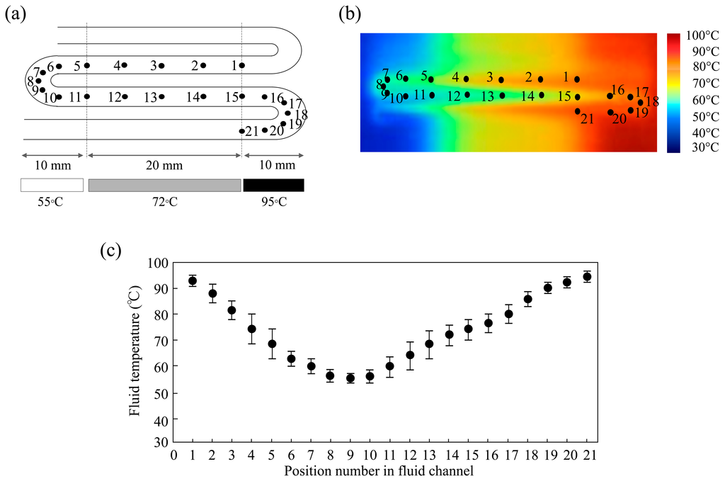 COP ZEONEX 480 (Tg of COP 480: 138 °C) was purchased from Zeon Corporation (Tokyo, Japan). COP is a 2-mm-thick thermoplastic biocompatible polymer. The characteristics of this heat-resistant resin are comparable to PC and PS (polystyrene). COP is superior for containing aqueous solutions due to its low water absorption coefficient and small nonspecific adsorption to fluidic channels. Pressure-sensitive adhesive (PSA) film (model number: 9795) was purchased from CS-LABO (Japan). The temperature of the channel close to the moving fluid can be analyzed since it is very thin; consequently, PSA film allows uniform bonding and exhibits thermotolerant properties.